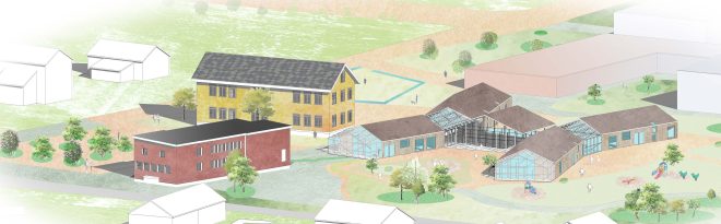 The new Nidarvoll barnehage is located at Sluppen, 3.5-kilometer away from Trondheim city centre. The design features a kindergarten, two heritage buildings, and the overall design program is driven by lowering carbon emissions throughout the design process from site scale to neighborhood scale. The proposed refurbishment scheme on listed buildings (gulhuset) is a new meeting point for residents, visitors and employees in Sluppen. The other heritage building (gymbygget) is integrated into the kindergarten to bring up the awareness and presence of its value among school employees and toddlers.