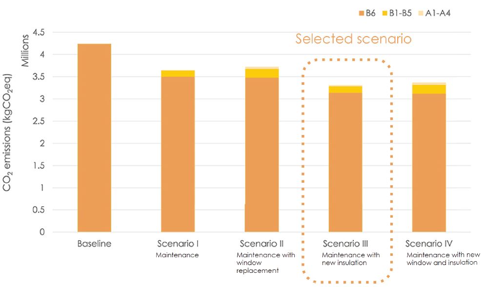 It was observed that operational energy emissions (B6) were significantly greater than the product stage, transportation to site, maintenance and replacement stage emissions combined. Although replacement of DGUs by TGUs reduces the operational energy emission slightly, the high embodied emission of TGUs result in a higher total emission. The cummulative emissions for each scenario were plotted to fi nd the scenario with least emissions. The Scenario III was found to have 22% lower emissions compared to the Baseline. The values are shown below.