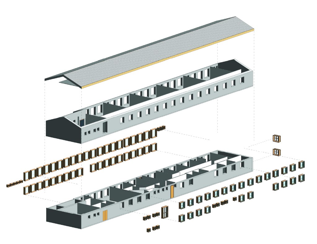 To decide, which buildings on the site should be kept and which ones aren‘t worth keeping, a Lifecycle Analysis has been carried out. As the end-of-life stage is only producing a very low percentage of CO2 emissions compared to the other stages, it was decided to remove, recycle and reuse the material of the Block A, B and C. The basement of the first two will be kept in-tact, as the production of concrete is very energy-intensive and it is not easy to recycle it properly. The windows of the buildings will be reused for the fence running along the borders of the school in order to let the children be connected to their surrounding. The interior walls of the kindergarten will also have some windows from these buildings. The concrete of the Block C will be used for the pavement of the new built infrastructure in Sluppen. The rest shall be processed, recycled and reused in new concrete or as layer in street construction. The wooden cladding of the Block B can be used for the roof of the parking area in the north of the site. Other parts can be used to build playground equipment for the kindergarten.